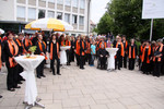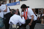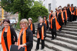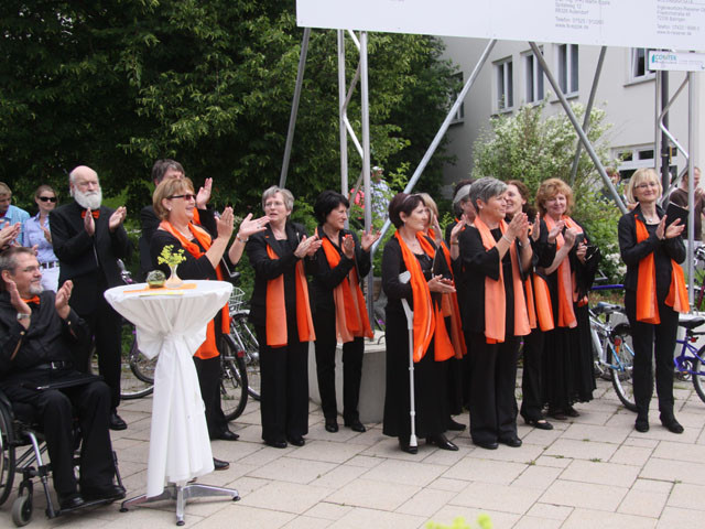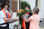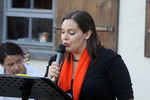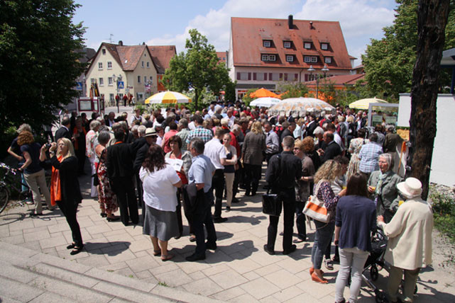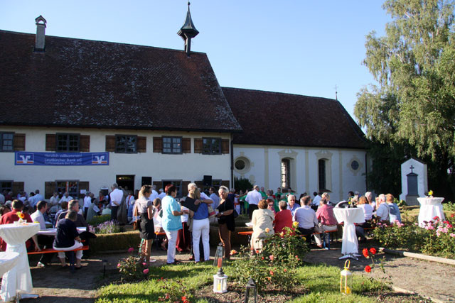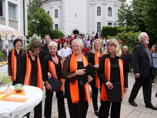 Nach dem feierlichen Auszug aus der Kirche waren alle Kirchenbesucher bei strahlendem Sonnenschein auf dem Klosterhof zu Häppchen (Backkünste der Chordamen) und Getränken bei musikalischer Untermalung der Stadtkapelle und die Bewirtung durch Einsatz der Narrenzunft vom Liederkranz eingeladen.