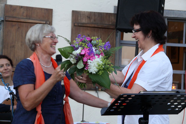 Mit Dank an die Konzertbesucher, Gäste und Freunde, an Frau Lauber und ihr Kurhaus-Team, Freddy Holzmüller für den „guten Ton“, mit Blumen und Weinpräsenten an alle Chorleiter, dem Pianisten Matthias Tappert am Flügel verabschiedeten sich die Sänger und Sängerinnen im Kurhaus. Helene Schaar richtete ihren ganz persönlichen Dank an den gesamten Chor für die hervorragenden Teamleistungen in den jeweils kurzen Vorbereitungszeiten für die einzelnen Auftritten in diesem Jubiläumsjahr.