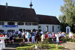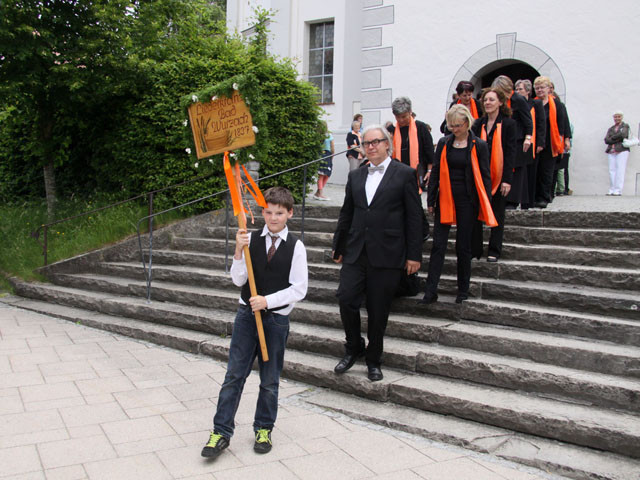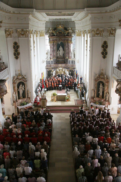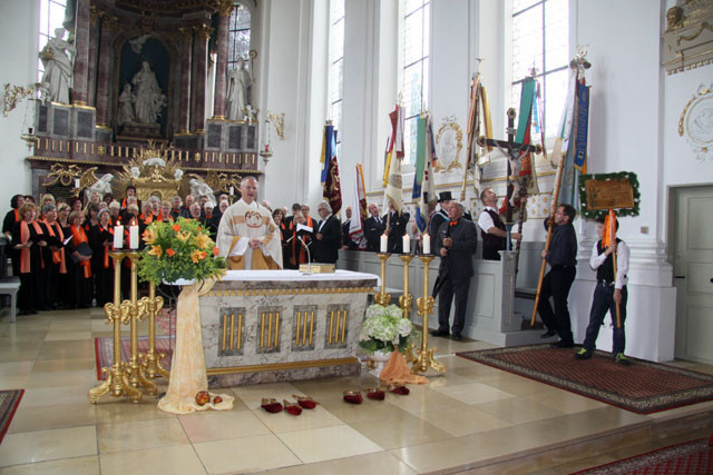 Kißlegg, Molpertshaus und Seibranz mit ihren zahlreichen Fahnenabordnungen teil. Dort wurde die feierliche Festmesse zelebriert. Die Wurzacher Vereine und auch Patenchöre schwenkten ihre Fahnen vor dem festlich geschmückten Altar.