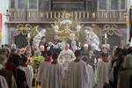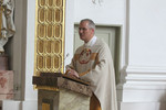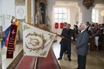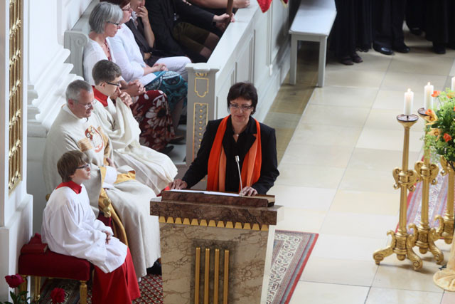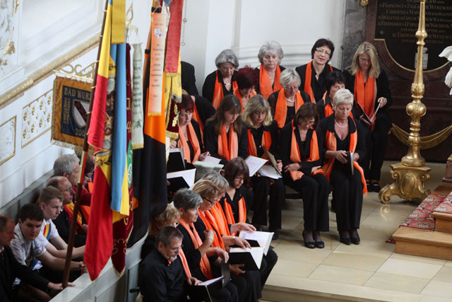 Pfarrer Stefan Maier, der den Festgottesdienst zelebrierte, stellte angesichts der zahlreichen Fahnenträger im Chorgestühl zufrieden fest, dass die ganze Stadt mitfeiert: „Wir feiern heute zusammen über den engeren Kreis des Liederkranzes hinaus und diese Gounod-Messe wurde nicht für uns oder den Liederkranz einstudiert, denn dieser Gesang ist die Antwort an Gott, der unser Tun möglich macht.“ Während der Gabenbereitung sang Michael Ocker die deutsche Version des Ave Maria von Schubert.