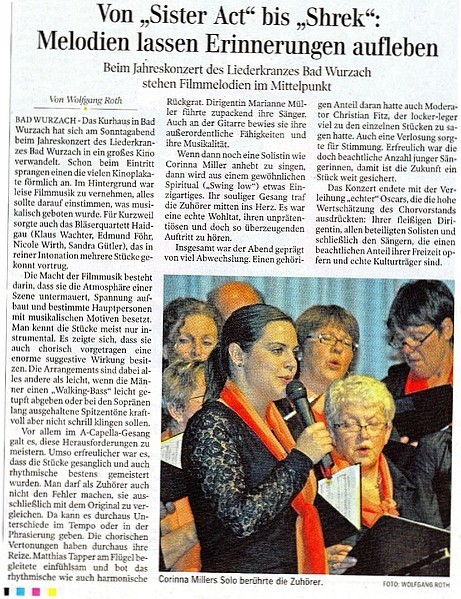 war das Motto unseres diesjährigen Jahreskonzerts. Unsere neue Chorleiterin Marianne Müller hatte ein Gesamtpaket geschnürt, d.h. nicht nur viele bekannte und beliebte Filmmelodien singen, sondern auch eine typische Kino-Atmosphäre schaffen.